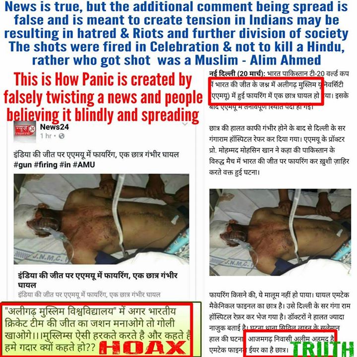 The screenshot of news being spread has an additional comment that the student was shot by Muslims as he was celebrating India’s win while it’s the other way around, the gun fires were in celebration and the student got hurt was a Muslim