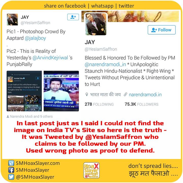 In last post just as I said I could not find the image on India TV’s Site so here is the truth. He used wrong photo as proof to defend. https://www.facebook.com/SMHoaxSlayer/photos/a.147357335599672.1073741828.140690692933003/344083729260364/?type=3