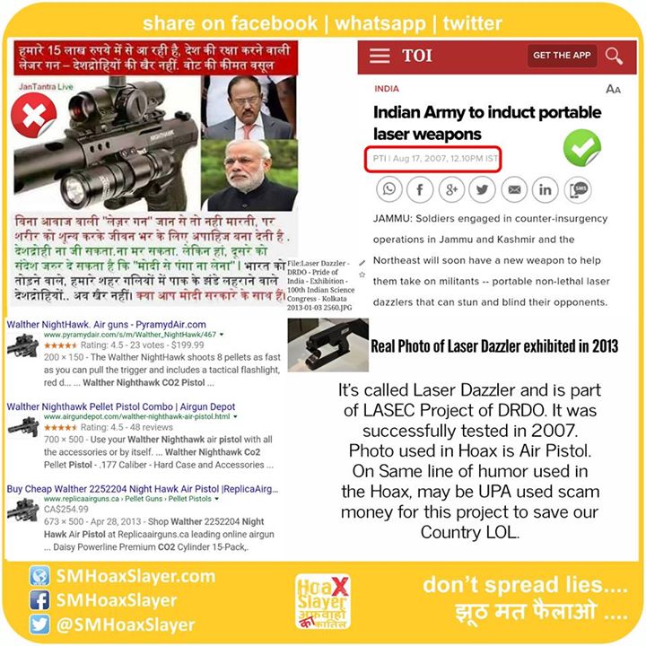 It’s called #Laser #Dazzler and is part of #LASTEC Project of @DRDO_India . It was successfully tested in 2007. Photo used in Hoax is not Laser Dazzler but Air Pistol.
