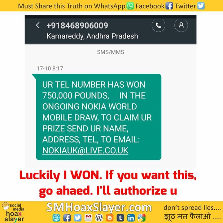 I’ve won but if u need, u can have it all, I can authorize u. https://www.facebook.com/SMHoaxSlayer/photos/a.147357335599672.1073741828.140690692933003/362041587464578/?type=3