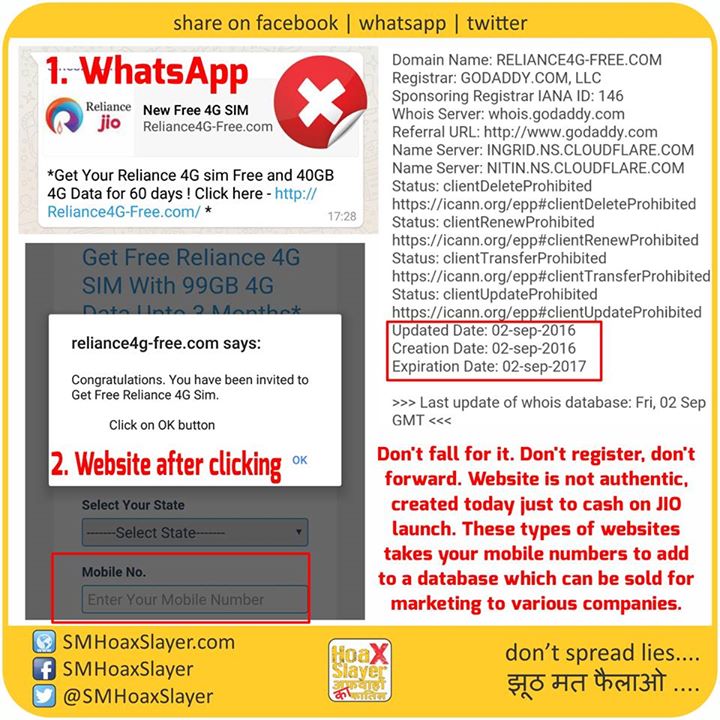 #Jio #Fraud #Spam Don’t fall for it. Don’t register, don’t forward. Website is not authentic, created today just to cash on JIO launch. These types of websites takes your mobile numbers to add to a database which can be sold for marketing to various companies. https://www.facebook.com/SMHoaxSlayer/photos/a.147357335599672.1073741828.140690692933003/338974513104619/?type=3