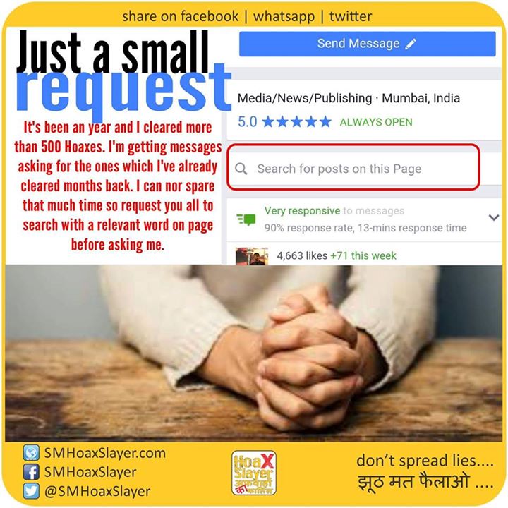 It’s been an year and I cleared more than 600 Hoaxes. I’m getting messages asking for the ones which I’ve already cleared months back and even twice or thrice. I can not spare that much time so request you all to search with a relevant word on page before asking me. Thanks https://www.facebook.com/SMHoaxSlayer/photos/a.147357335599672.1073741828.140690692933003/349799742022096/?type=3