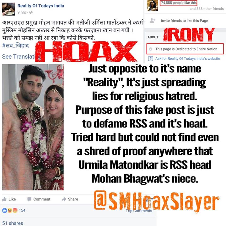 Tried hard but could not find even a shred of proof anywhere that Urmila Matondkar is RSS head Mohan Bhagwat’s niece.