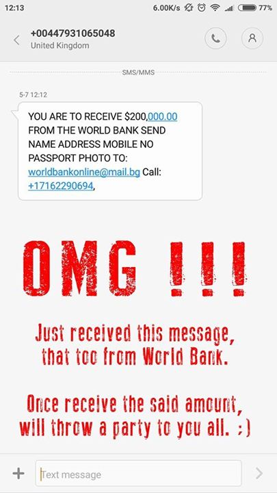 Once receive the said amount, will throw a party to you all. 😉 https://www.facebook.com/SMHoaxSlayer/photos/a.147357335599672.1073741828.140690692933003/282716905397047/?type=3
