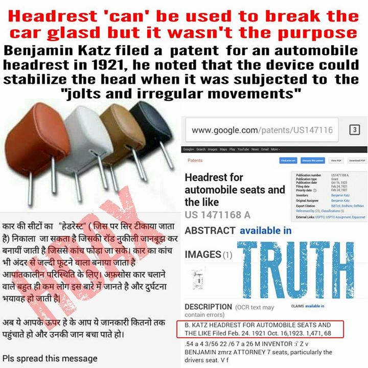 #LATEST #ViralSach – #Headrest ‘can’ be used to break #car glass but it wasn’t it’s main purpose. The only purpose of it was to provide comfort to head, adjustable as per the height of the person sitting on the seat. The patent was filed by Benjamin Katz in 1921. Link given below.