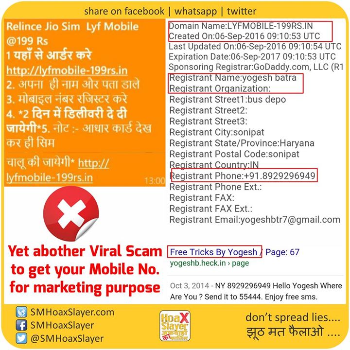 #Lyf #Mobile #Fraud #Scam Another way of getting your mobile number to earn money be selling database of such mobile numbers. https://www.facebook.com/SMHoaxSlayer/photos/a.147357335599672.1073741828.140690692933003/343125062689564/?type=3