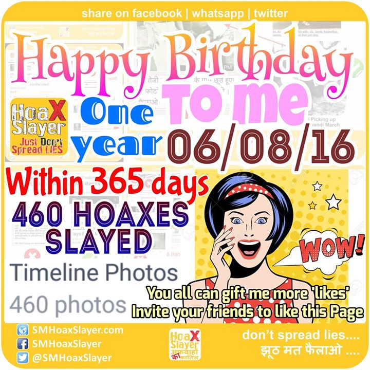 #MannKiBaat It’s been an year. 365 days, 460 Hoaxes Slayed. Did I disappoint anyone ? Tried not to. Although I reply within minutes but if I don’t either it is a long job or not possible at all. I deal in black and white, like obvious fakes/photoshopped/lies as per common sense. But not on views of people, figures/stats, quotes. Like my yesterday’s post, many send me a image of some celebrity with a quote, now if he/she hasn’t said it how can I find ? in fact I tried to contact them for clarification and even succeeded once but do I have to ? Doesn’t it needs common sense to understand ? If the celebrity really said it, it must be in media and so on Google but it is not.