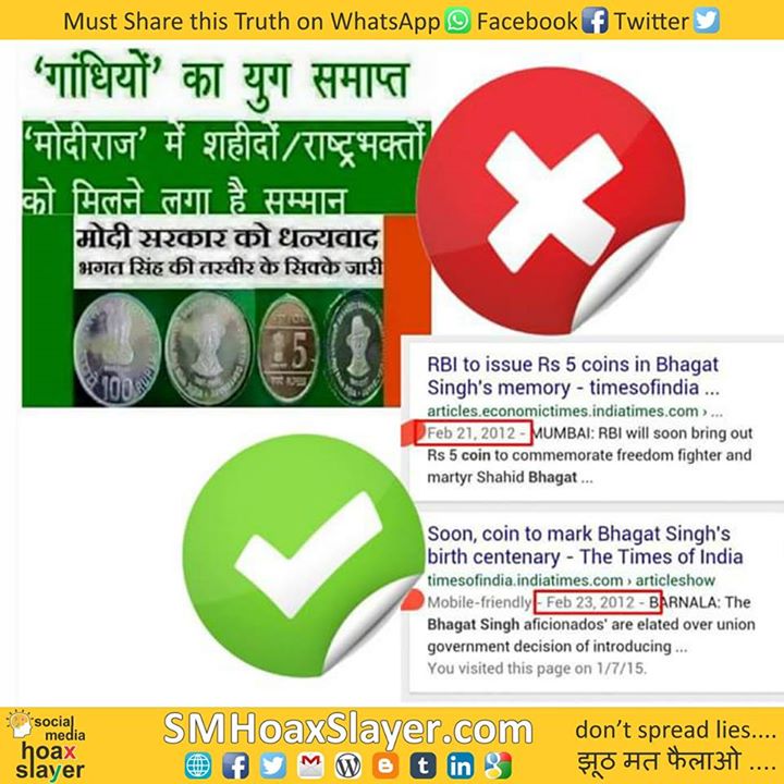 Many are forwarding this as Modi ji has started coins with Bhagat Singh on it. While this is a rare collectible coin made much before Modi became PM check the dates – 2012 https://www.facebook.com/SMHoaxSlayer/photos/a.147357335599672.1073741828.140690692933003/416001492068587/?type=3