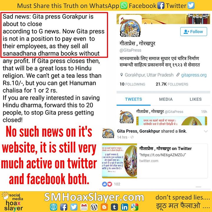 @GitaPress is still very active on facebook & twitter, it nowhere wrote about this news too. https://www.facebook.com/SMHoaxSlayer/photos/a.147357335599672.1073741828.140690692933003/373459049656165/?type=3