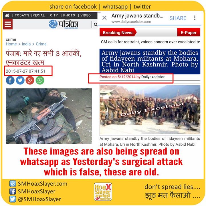 whatsapp etc. Claiming to be of Yesterday’s surgical attack on Pakistan by Indian Army. Photos are misleading, these are old. https://www.facebook.com/SMHoaxSlayer/photos/a.147357335599672.1073741828.140690692933003/352843121717758/?type=3