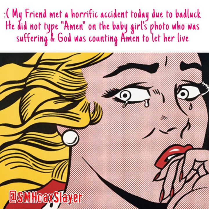 He did not type “Amen” on the baby girl’s photo who was suffering & God was counting Amen to let her live https://www.facebook.com/SMHoaxSlayer/photos/a.147357335599672.1073741828.140690692933003/307225962946141/?type=3