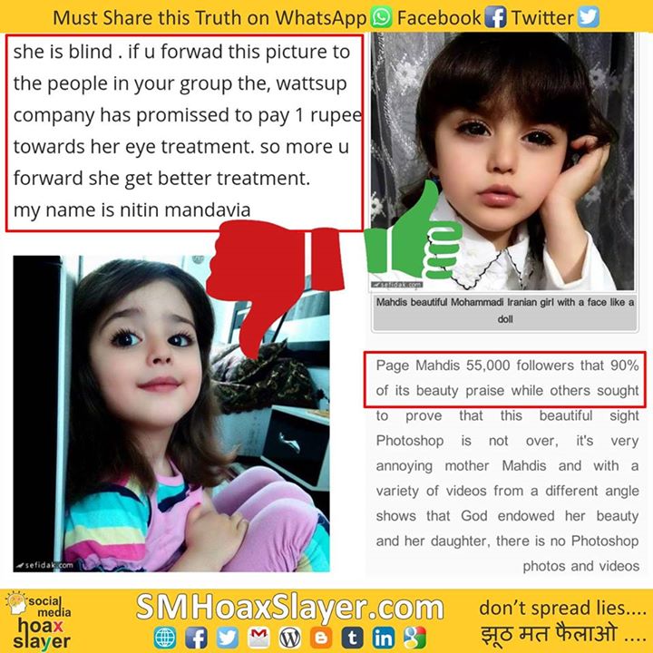 Lie: This Hoax is Viral where some Nitin Mandavia is claiming this baby girl is blind and whatsapp will pay for her treatment with every forward.