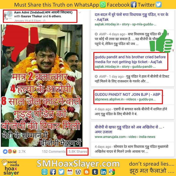 No, BJP did not give ticket to so called criminal Guddu Pandit. 5800 shares of a Lie.