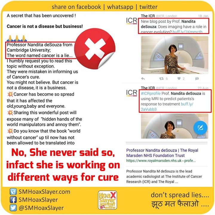 No, @ICR_London Prof. Nandita never said so, infact she is working on different ways for cure https://www.facebook.com/SMHoaxSlayer/photos/a.147357335599672.1073741828.140690692933003/345404835794920/?type=3