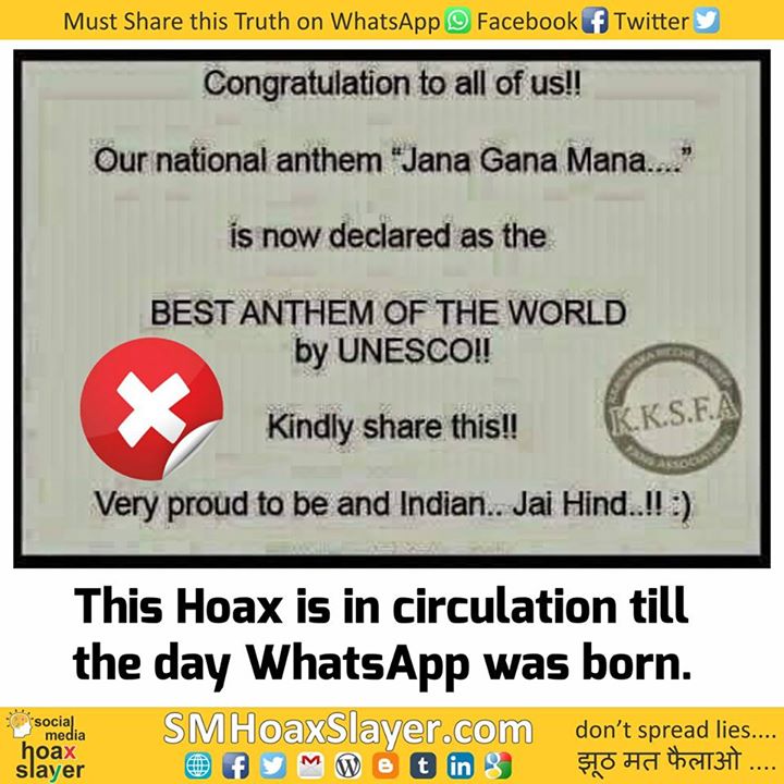 Source: http://m.indiatoday.in/story/India+anthem+email+false:+Unesco/1/16449.html https://www.facebook.com/SMHoaxSlayer/photos/a.147357335599672.1073741828.140690692933003/370046913330712/?type=3