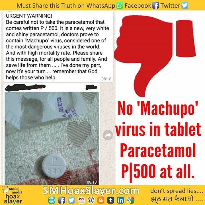 No ‘Machupo’ virus in tablet Paracetamol P|500 at all. https://www.facebook.com/SMHoaxSlayer/photos/a.147357335599672.1073741828.140690692933003/419964795005590/?type=3