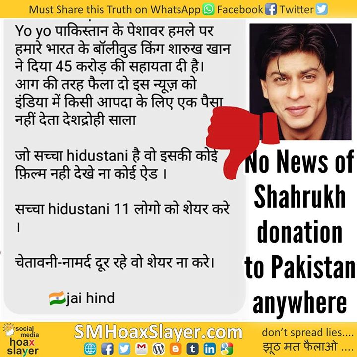 No news of @imsrk donating to pakistan anywhere. ShahRukh’Holics https://www.facebook.com/SMHoaxSlayer/photos/a.147357335599672.1073741828.140690692933003/427277394274330/?type=3