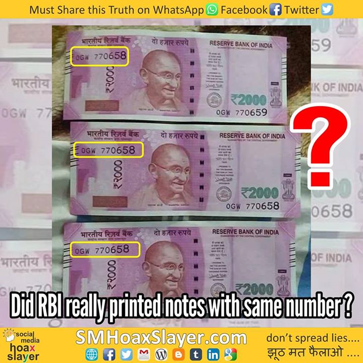 Photos of various notes, new 2000/500 to old 1000/500 are viral on Social Media which are shown to have same numbers.. Few claim it as a fault by RBI, few say Congress get it intentionally. How in the world can it be true?