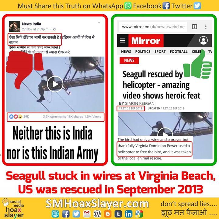 Truth: http://www.mirror.co.uk/news/weird-news/seagull-rescued-helicopter—amazing-2306432 https://www.facebook.com/SMHoaxSlayer/photos/a.147357335599672.1073741828.140690692933003/392359151099488/?type=3