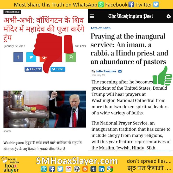 Truth: https://www.washingtonpost.com/news/acts-of-faith/wp/2017/01/19/praying-at-the-inaugural-service-an-imam-a-rabbi-a-hindu-priest-and-an-abundance-of-pastors/?utm_term=.25dc5c11008e https://www.facebook.com/SMHoaxSlayer/photos/a.147357335599672.1073741828.140690692933003/410997302569006/?type=3