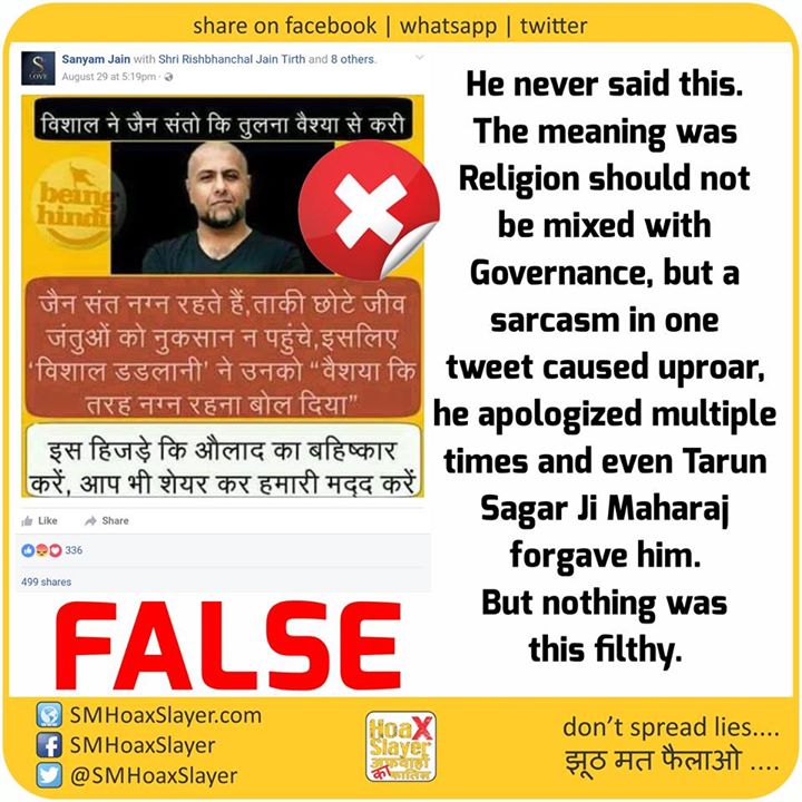 TRUTH: http://indianexpress.com/article/india/india-news-india/jain-monk-tarun-sagar-forgives-vishal-dadlani-for-irreverent-tweet-3001838/ https://www.facebook.com/SMHoaxSlayer/photos/a.147357335599672.1073741828.140690692933003/337701629898574/?type=3
