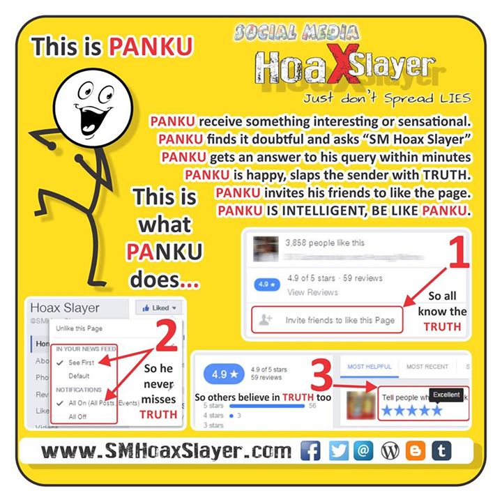 If I’m not asking for much, do write ur review and invite your friends to like the page. The only point is People appreciate a beautiful lie but not real truth. Thanks to all who already did this https://www.facebook.com/SMHoaxSlayer/photos/a.147357335599672.1073741828.140690692933003/318291021839635/?type=3
