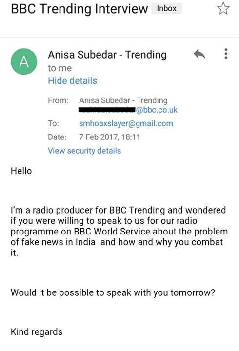 Ok, just ended the interview, with Anisa Subedar, Producer of BBC Trending radio show from United Kingdom. It lasted around half an hour. It was on Skype, so cudn’t record, but I think, I did good. They will air it next week in UK, will share the link here then. https://www.facebook.com/SMHoaxSlayer/photos/a.147357335599672.1073741828.140690692933003/422049728130430/?type=3