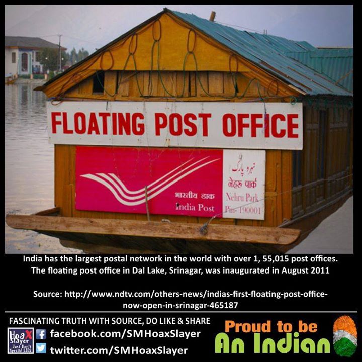 India has the largest postal network in the world with over 1, 55,015 post offices. The floating post office in Dal Lake, Srinagar, was inaugurated in August 2011