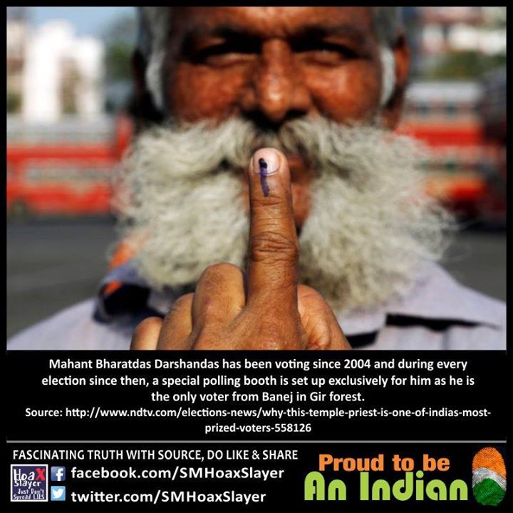 Mahant Bharatdas Darshandas has been voting since 2004 and during every election since then, a special polling booth is set up exclusively for him as he is the only voter from Banej in Gir forest.