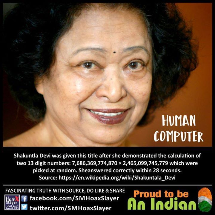 Shakuntla Devi was given this title after she demonstrated the calculation of two 13 digit numbers: 7,686,369,774,870 × 2,465,099,745,779 which were picked at random. Sheanswered correctly within 28 seconds.