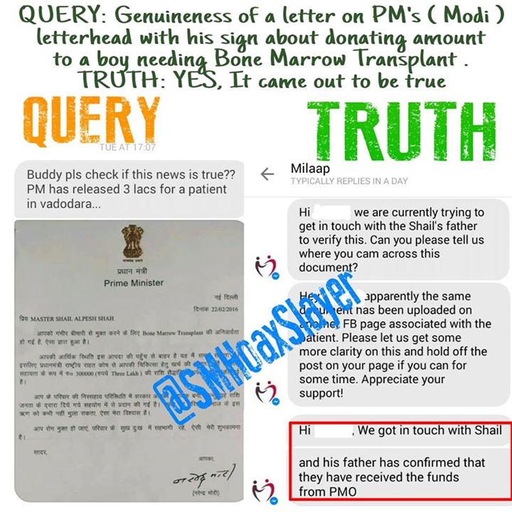 ACTION: We are living in a Photoshop era plus it’s my job to find source of truth. I tried but couldn’t find any single news anywhere which increased curiosity. But I did find fund raising campaign – on a site – Milaap.org doing great social work. So I contacted them through Twitter and Facebook. They took a day to confirm and did from the boy’s father Mr. Alpesh Shah and found it to be TRUE. YES the boy did get funds from PMO