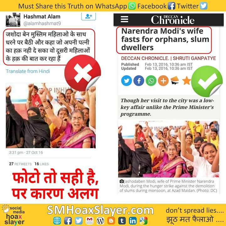 2. http://www.mid-day.com/articles/ahead-of-narendra-modis-mumbai-visit-pms-wife-jashodaben-fasts-for-slum-dwellers/16952154 https://www.facebook.com/SMHoaxSlayer/photos/a.147357335599672.1073741828.140690692933003/406016989733704/?type=3