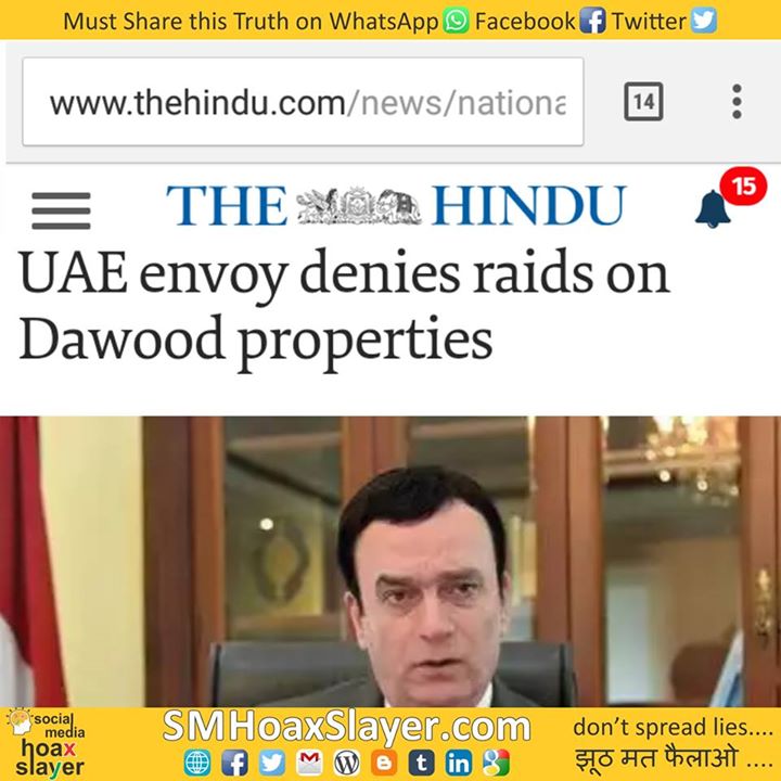 Truth: http://www.thehindu.com/news/national/UAE-envoy-denies-raids-on-Dawood-properties/article17046772.ece