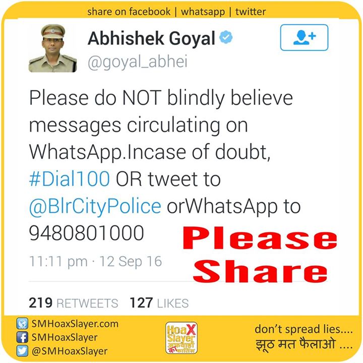 Share Widely. Friends from Bangalore/Karnataka, Do not believe any message without any confirmation. https://www.facebook.com/SMHoaxSlayer/photos/a.147357335599672.1073741828.140690692933003/344308369237900/?type=3
