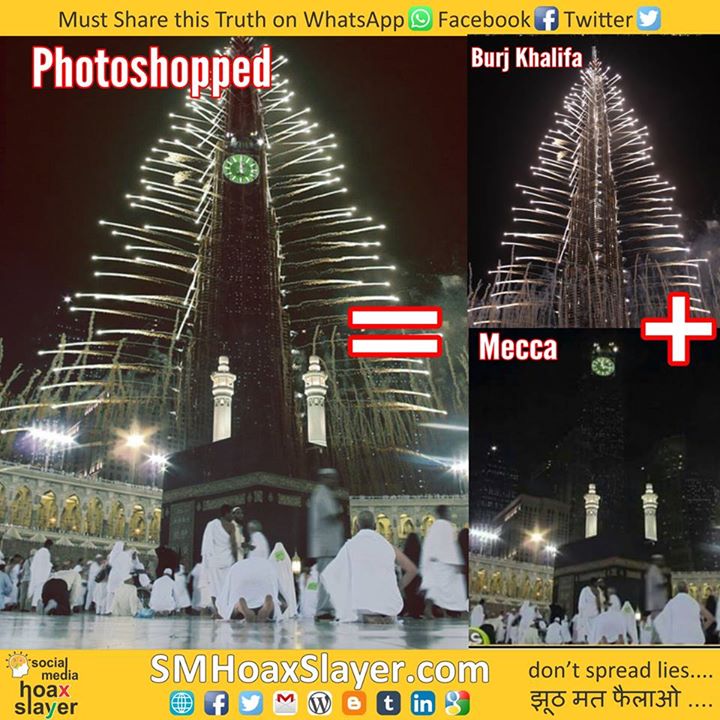 Well, it’s Photoshopped. A photo of 2010 of Burj Khalifa, tallest building in the world is morphed on Mecca photo.