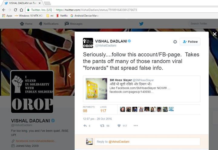 Proof: https://twitter.com/VishalDadlani/status/791891643381276673 https://www.facebook.com/SMHoaxSlayer/photos/a.147357335599672.1073741828.140690692933003/398740520461351/?type=3