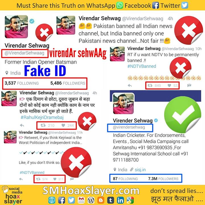 1. The fake id has ‘a’ instead of ‘e’ in Virender & an extra ‘a’ in Sehwag.