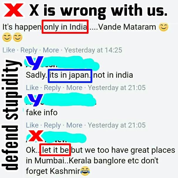 X is proud “Only in India” , says he is proud followed with ‘Vande Matram’, Y tells him the truth, X defends with excuses instead of accepting and moving on.