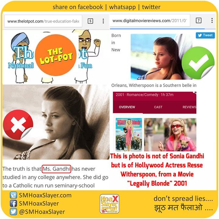 This is photo is not of Sonia Gandhi but is of Hollywood Actress @RWitherspoon from a Movie “Legally Blonde”