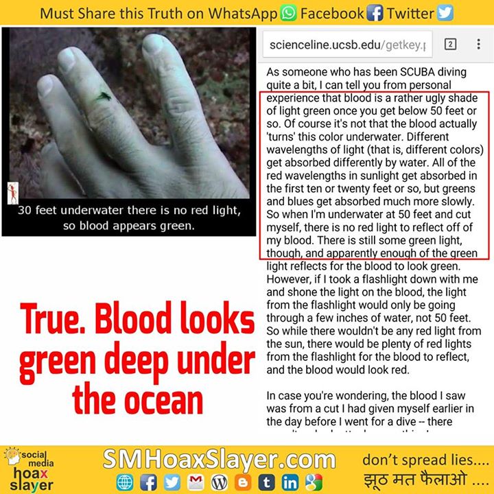 True, Blood looks green deep under the ocean.