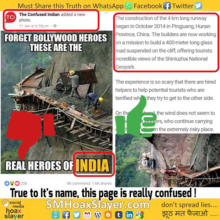 Truth: http://www.meionorte.com/entretenimento/curiosidade/funcionarios-arriscam-suas-vidas-para-construir-passarela-em-penhasco-na-china-269158 https://www.facebook.com/SMHoaxSlayer/photos/a.147357335599672.1073741828.140690692933003/405549836447086/?type=3