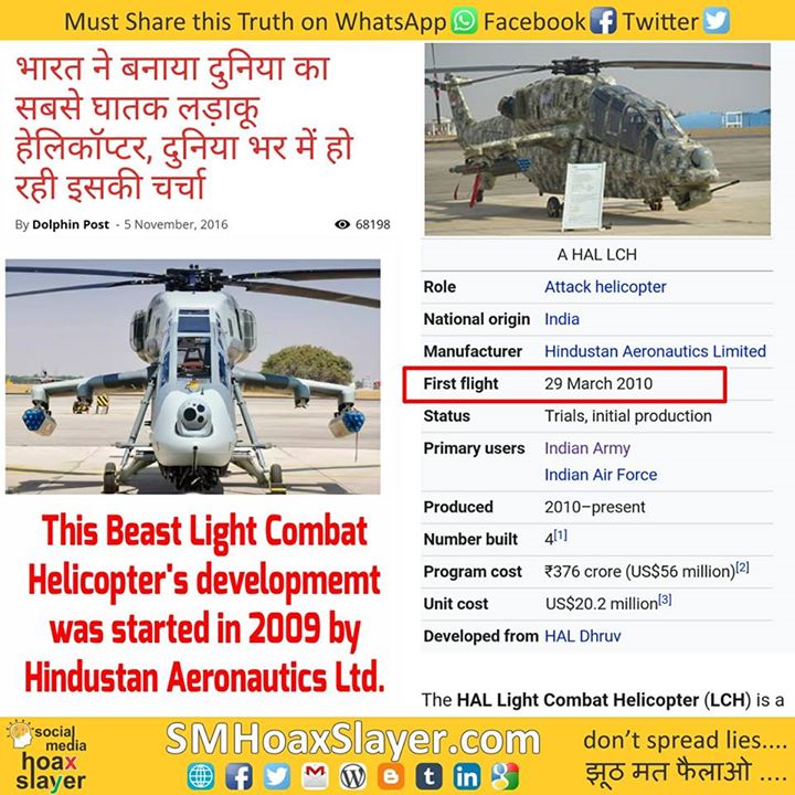 Viral: http://www.dolphinpost.com/light-combat-helicopter https://www.facebook.com/SMHoaxSlayer/photos/a.147357335599672.1073741828.140690692933003/373243999677670/?type=3