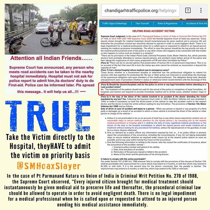 TRUE, you can take the #accident #victim directly to the #hospital and they “HAVE” to start the #procedure on priority basis to save the life. Supreme court judgement in 2013 –