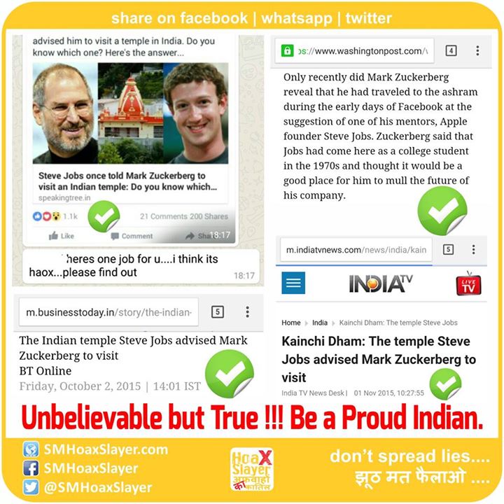 3. http://www.businesstoday.in/current/corporate/the-indian-temple-steve-jobs-advised-mark-zuckerberg-to-visit/story/224351.html https://www.facebook.com/SMHoaxSlayer/photos/a.147357335599672.1073741828.140690692933003/321893164812754/?type=3