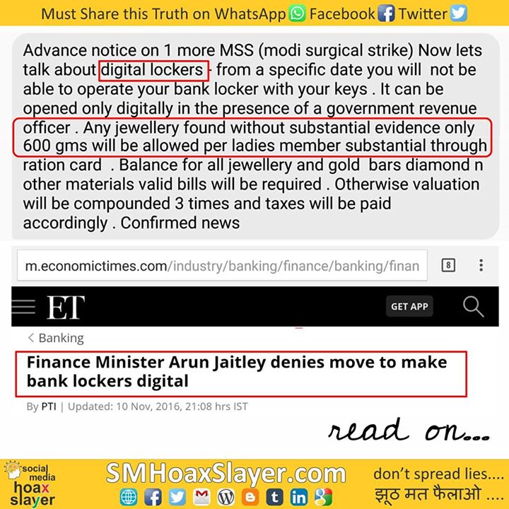 Source: http://m.economictimes.com/industry/banking/finance/banking/finance-minister-arun-jaitley-denies-move-to-make-bank-lockers-digital/articleshow/55357331.cms https://www.facebook.com/SMHoaxSlayer/photos/a.147357335599672.1073741828.140690692933003/375114682823935/?type=3