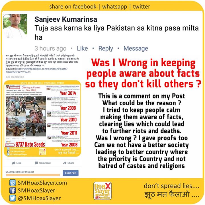 Was I Wrong in keeping people aware about facts so they don’t kill others ? https://www.facebook.com/SMHoaxSlayer/photos/a.147357335599672.1073741828.140690692933003/330753783926692/?type=3