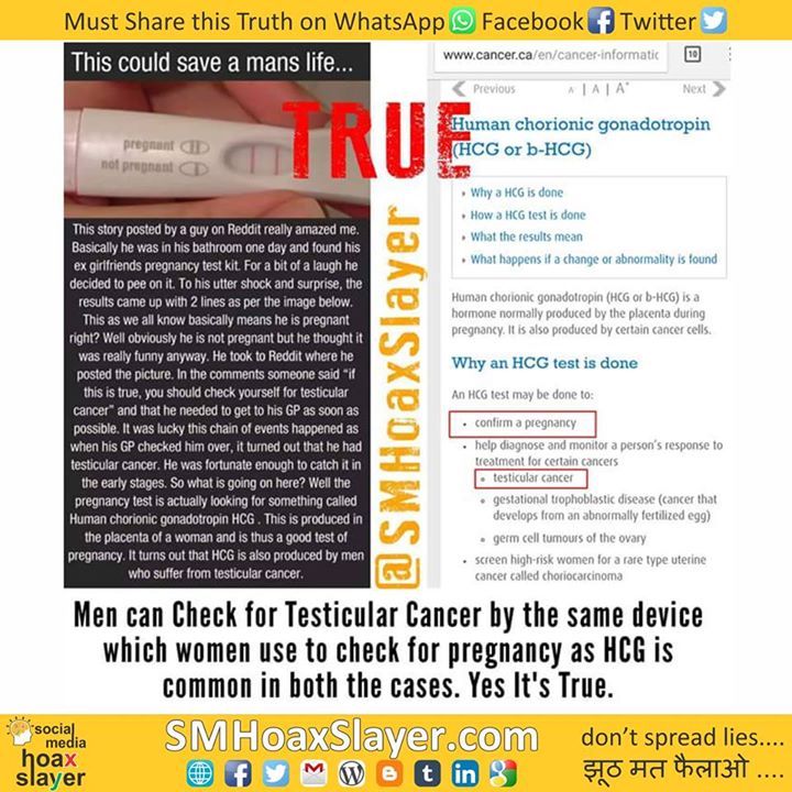 2. http://www.testicularcancerawarenessfoundation.org/tcaf-blog/2015/3/12/the-truth-about-testicular-cancer-markers-and-detection-with-pregnancy-tests https://www.facebook.com/SMHoaxSlayer/photos/a.147357335599672.1073741828.140690692933003/404075359927867/?type=3