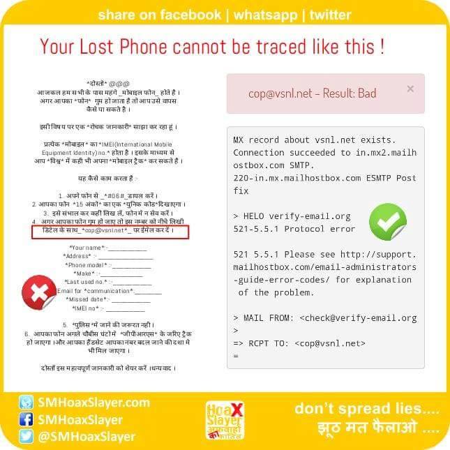 Your Lost #Mobile can’t be traced by sending #IMEI details to “Cop@vsnl.net” as it doesn’t exist.